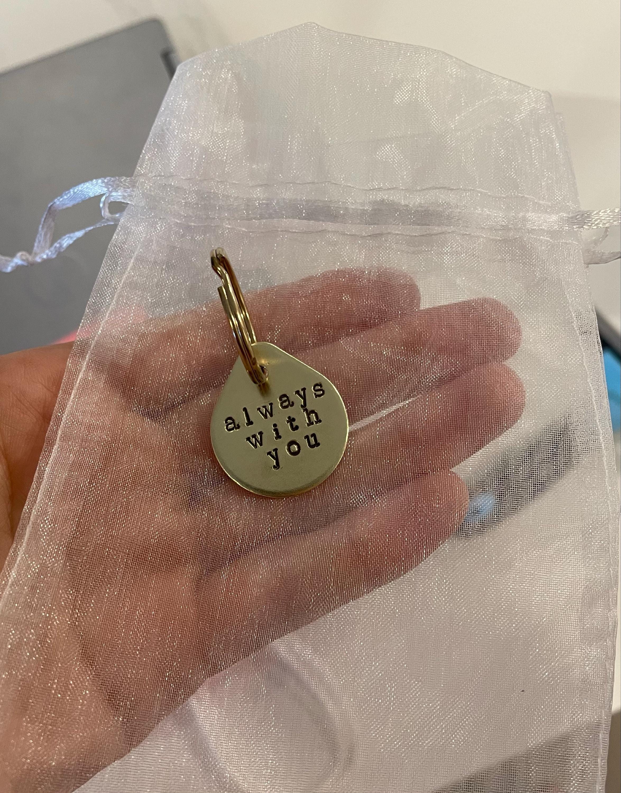 This classy little brass teardrop shaped tag is hand-stamped with the text of your choice. Tag is 1 inch x 1 1/8 inch at widest height and length and has a gold colored split ring attached.