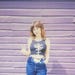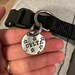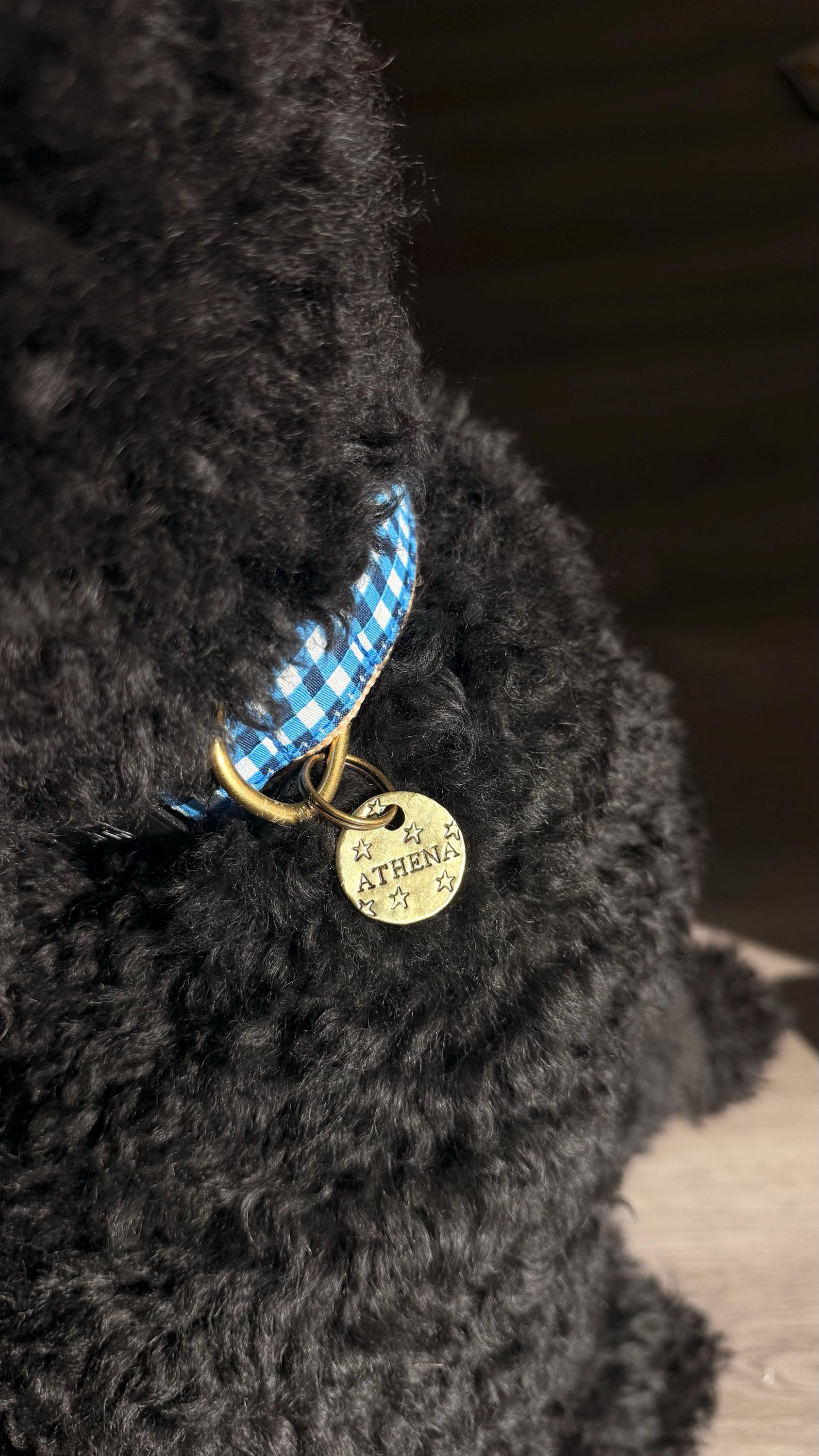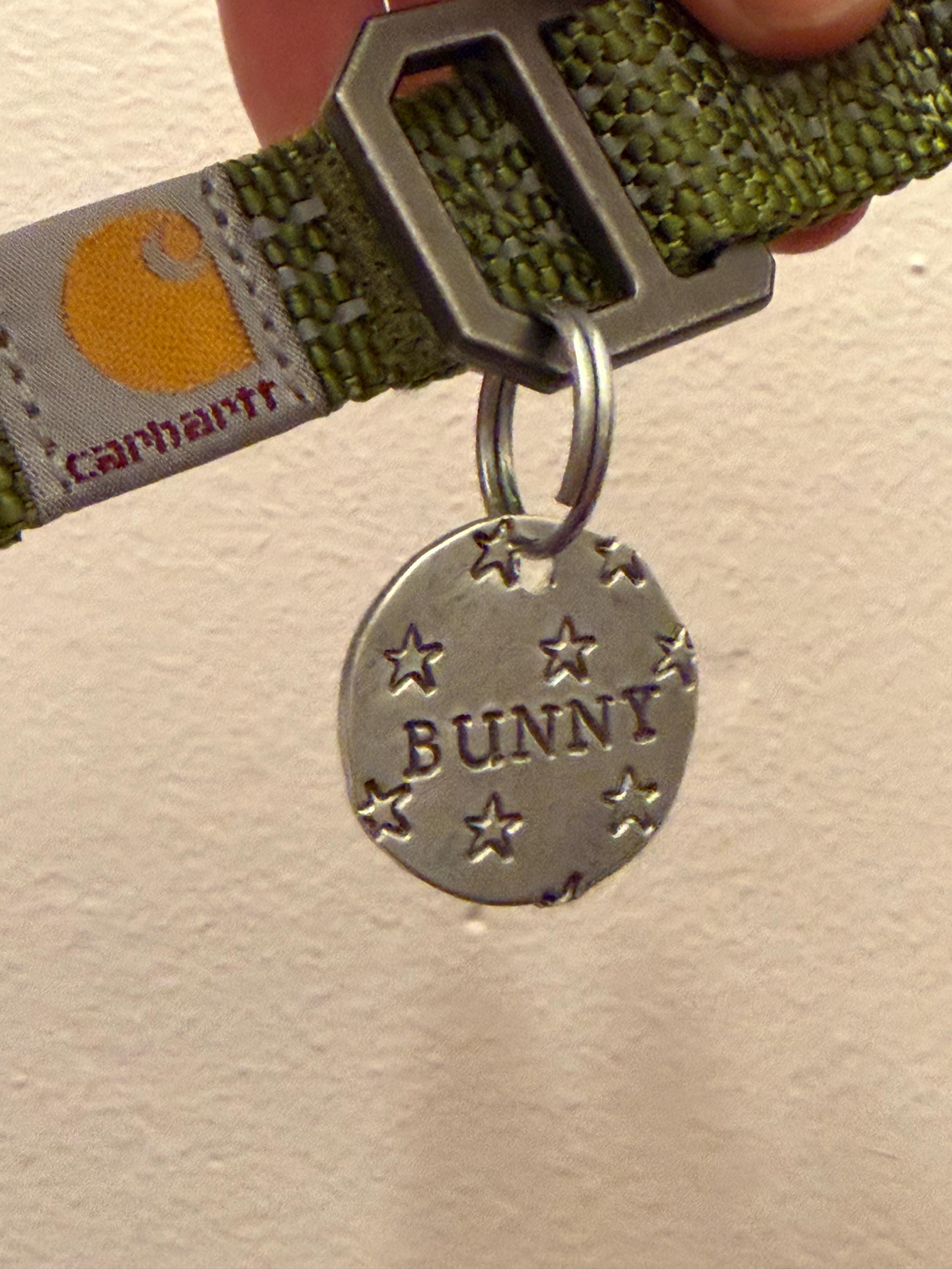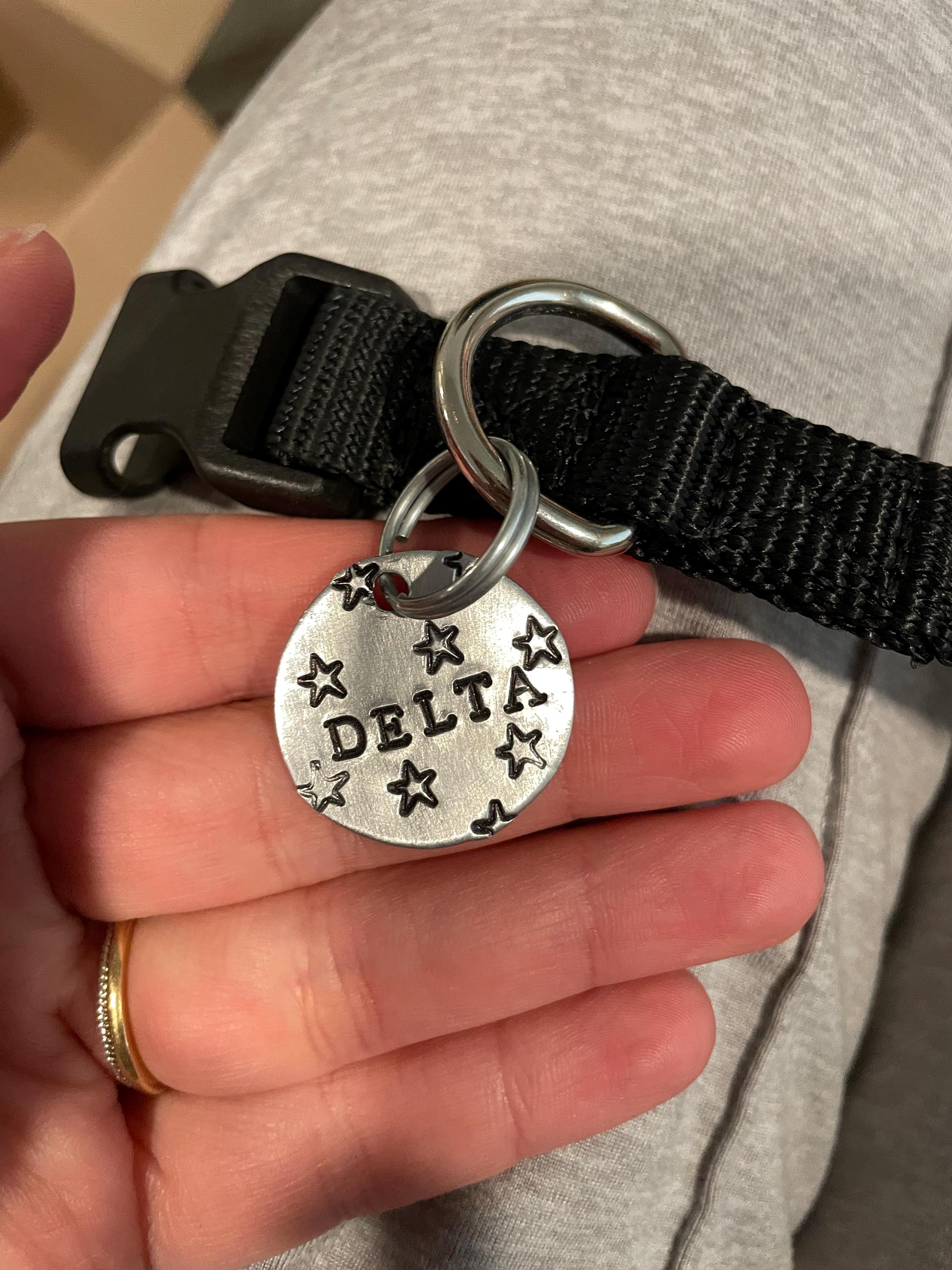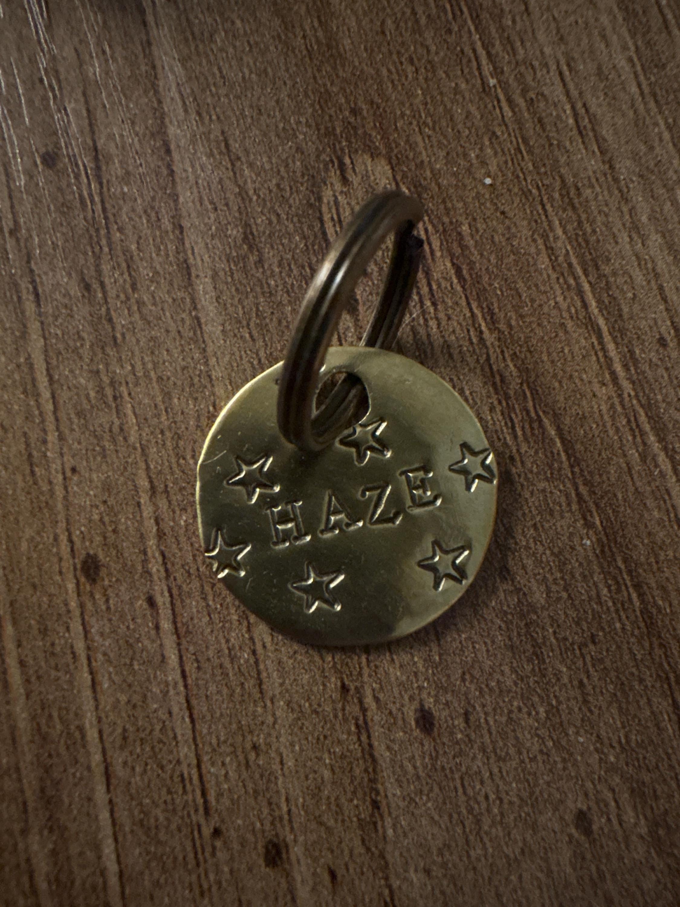 Simple, classic 1 inch (about the size of a quarter) name tag with pet's name hand stamped in center with stars scattered at random on the front. Back of tag has phone number curved along edge.