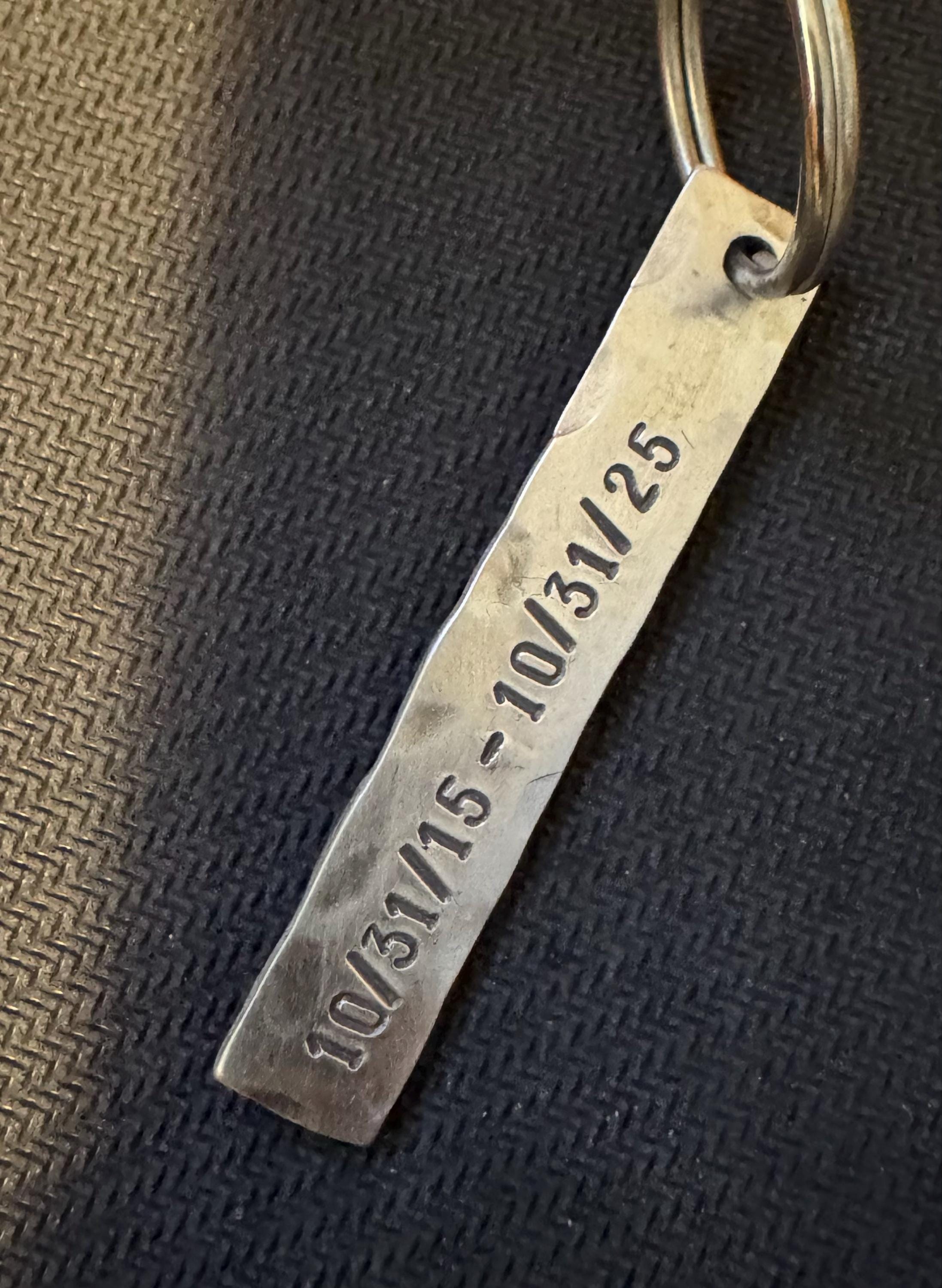 Each item is individually hand-stamped one character at a time. No two items will ever be the same. Expect differences in alignment, spacing and depth of impression.